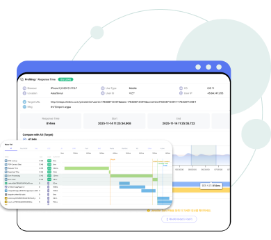 모든 프론트 구간의 개별 고객 성능 만족도를 측정하여 사용성과 성능 저하 발생 시 고객 환경 기준에서의 원인을 추적할 수 있도록 지원합니다.